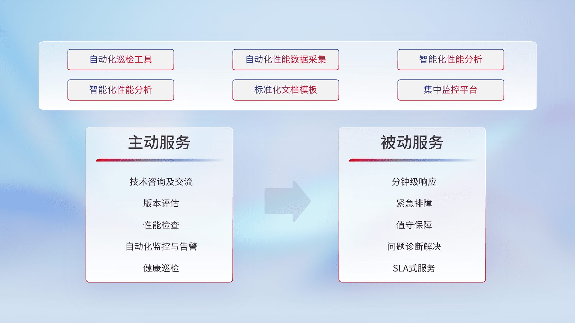 智能化工具和标准化文档,,,,保障服务质量,,,提供主动服务(包含技术咨询、、、、版本评估、、、性能检查、、、、自动化监控与告警、、、、健康巡检)和被动服务包含(分钟级响应、、、紧急排障、、值守保障、、问题诊断解决、、SLA服务)。。。