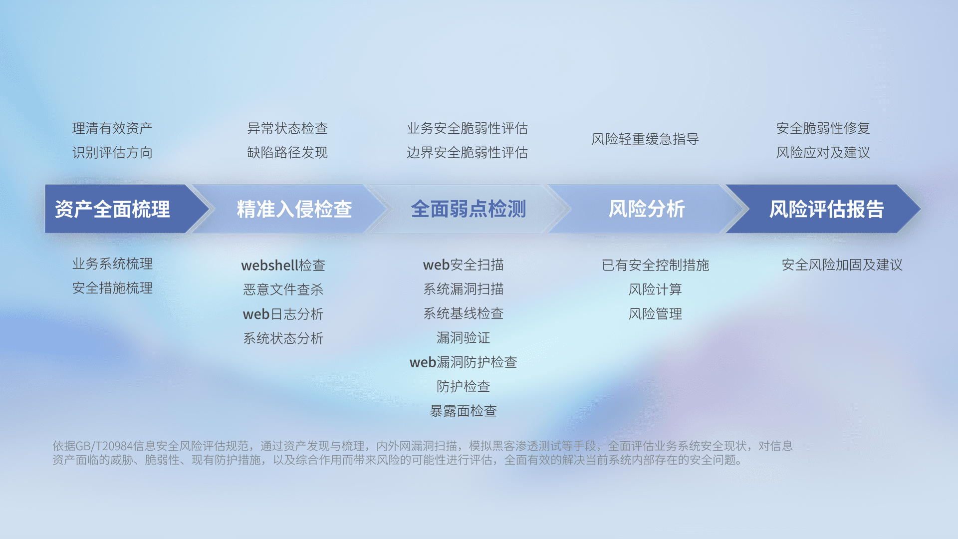针对客户行业特性,,以专业的安全服务+多厂商联合解决方案提供专属的一站式安全管理服务,,,帮助客户全面感知网络空间威胁,,,基于识别、、、检测、、分析、、、防护、、监测、、、响应的服务理论模型,,从方案咨询、、集成交付、、、、评估验证、、、优化加固、、、、运维运营,,致力于为客户提供完整的闭环管理式安全服务。。以实战经验为客户打造高抵御风险的安全体系,,,帮助客户发现威胁、、、、对抗威胁、、、、处置威胁,,,不断积累安全对抗能力,,,持续保障数字化安全。。。